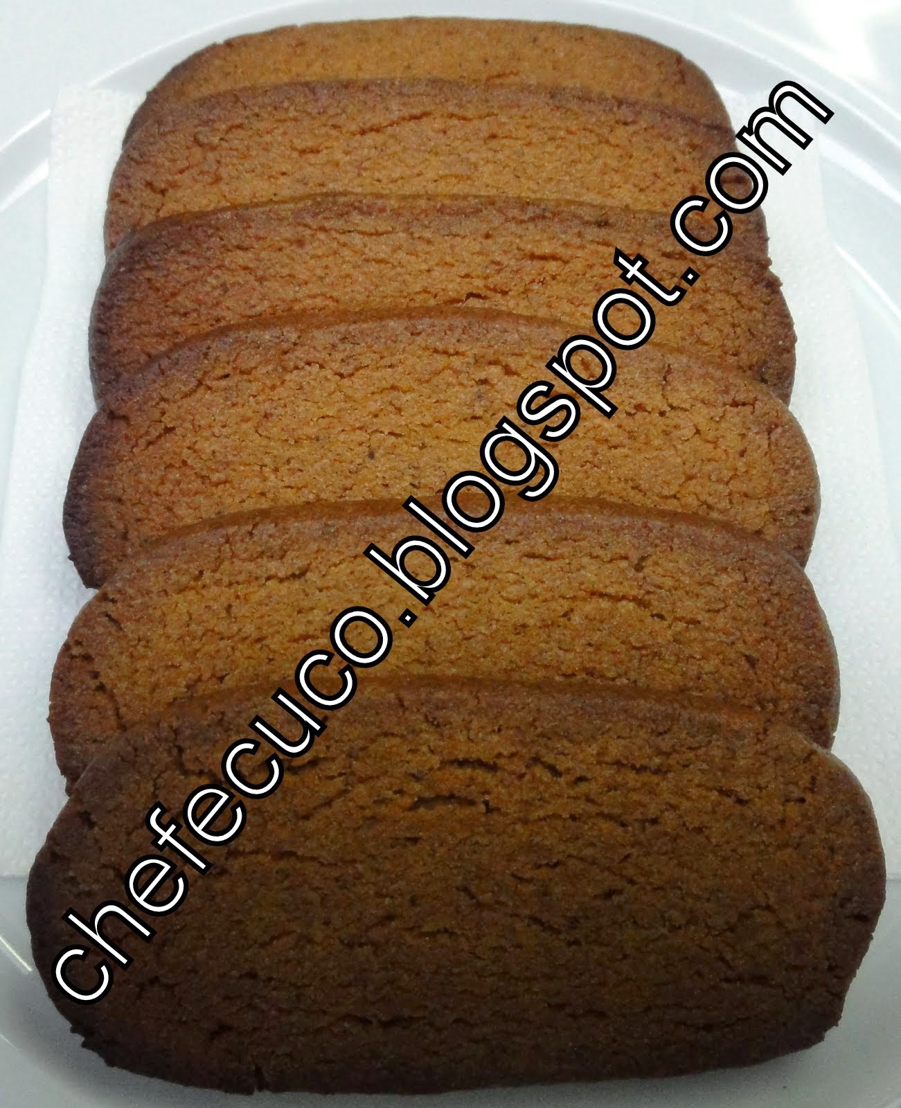 Retirar os "lingotes" de massa e cortar em fatias de 4 a 5 mm de espessura. Colocar num tabuleiro forrado com uma folha de papel vegetal. Colocar ao forno quente a 180ºC durante cerca de 12 minutos consoante o forno. Passado esse tempo os biscoitos parecem moles mas ao esfriar acabaram por ficarem secos. Colocar numa grelha.